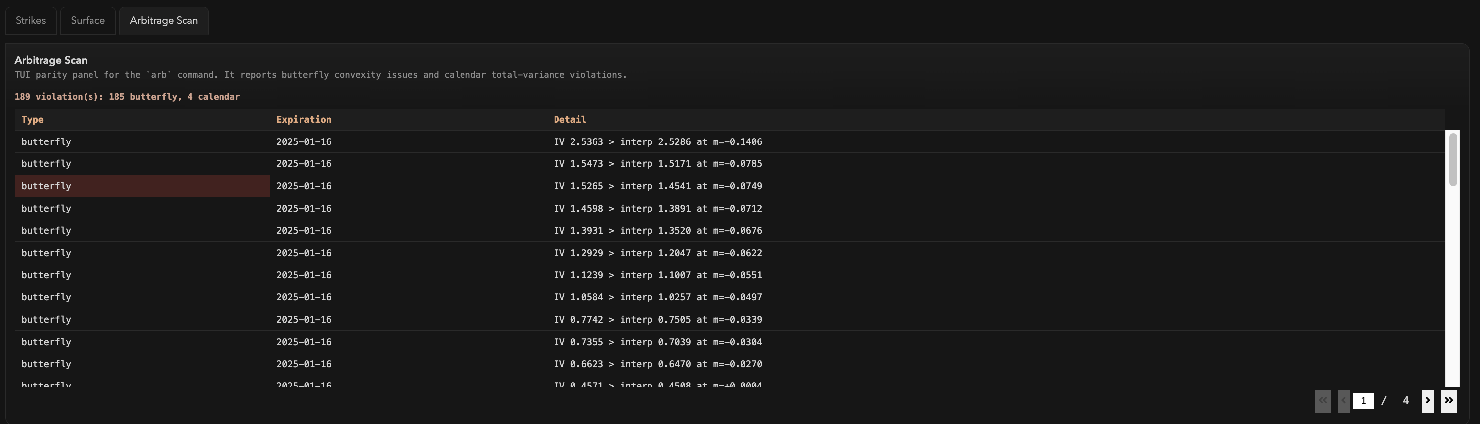 Web — Arbitrage Scan — 189 violations detected (185 butterfly, 4 calendar) with type, expiration, and constraint details