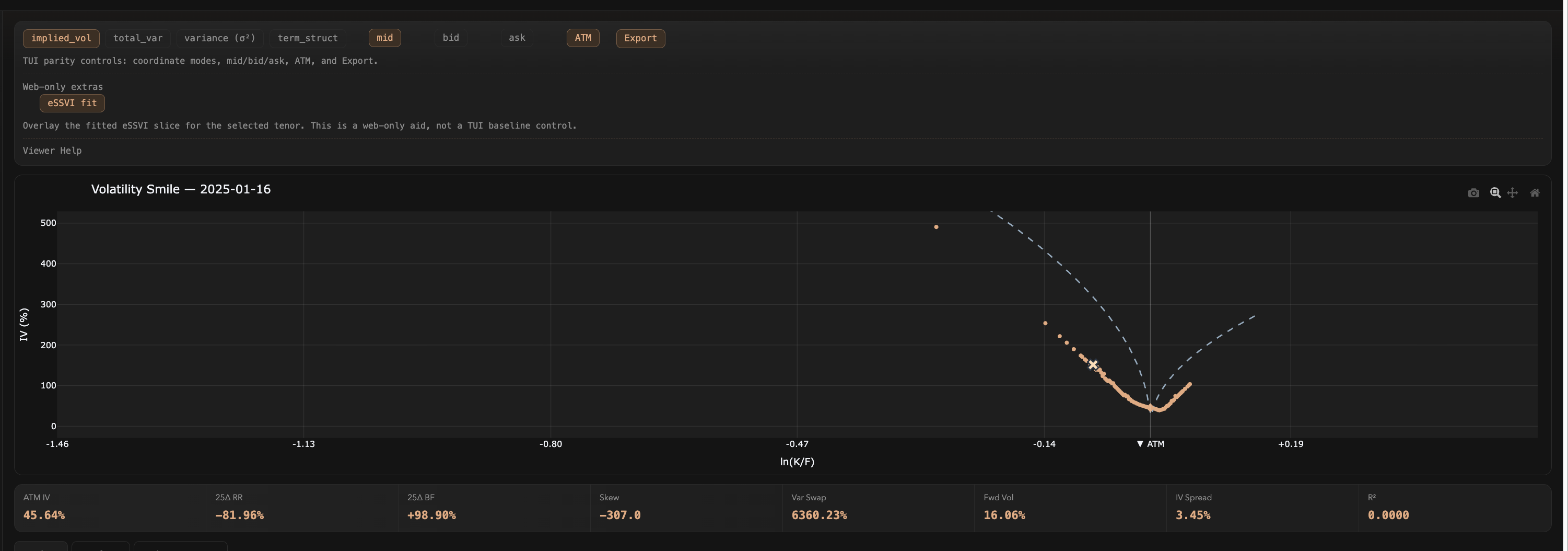Web — Smile Controls + Stats — Coordinate mode buttons, series toggles, ATM marker, export, and 8-metric stats grid