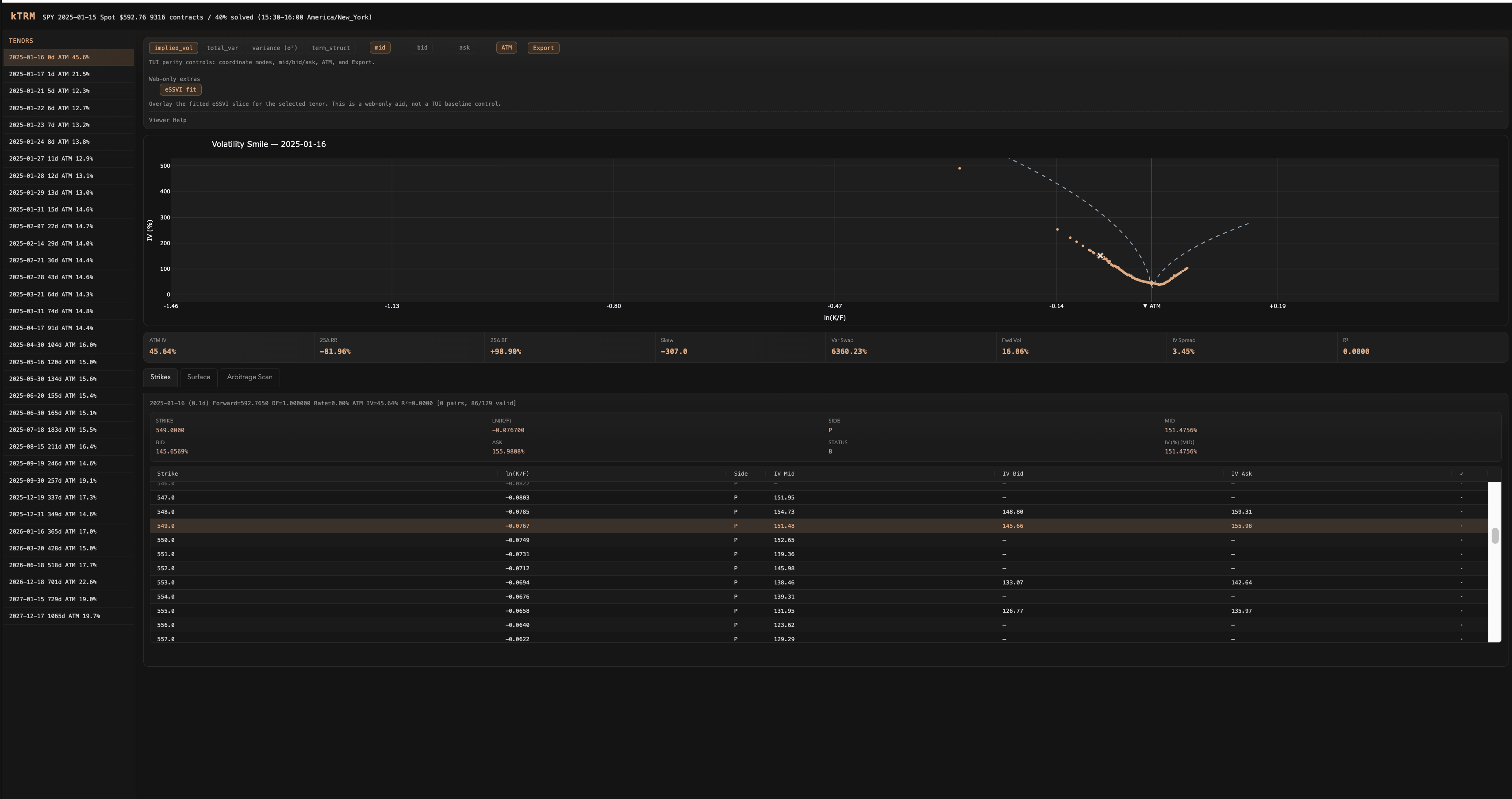 Web — Volatility Smile + eSSVI Fit — Dash dashboard with smile plot, eSSVI fit overlay, stats grid, and strike table for SPY 2025-01-16