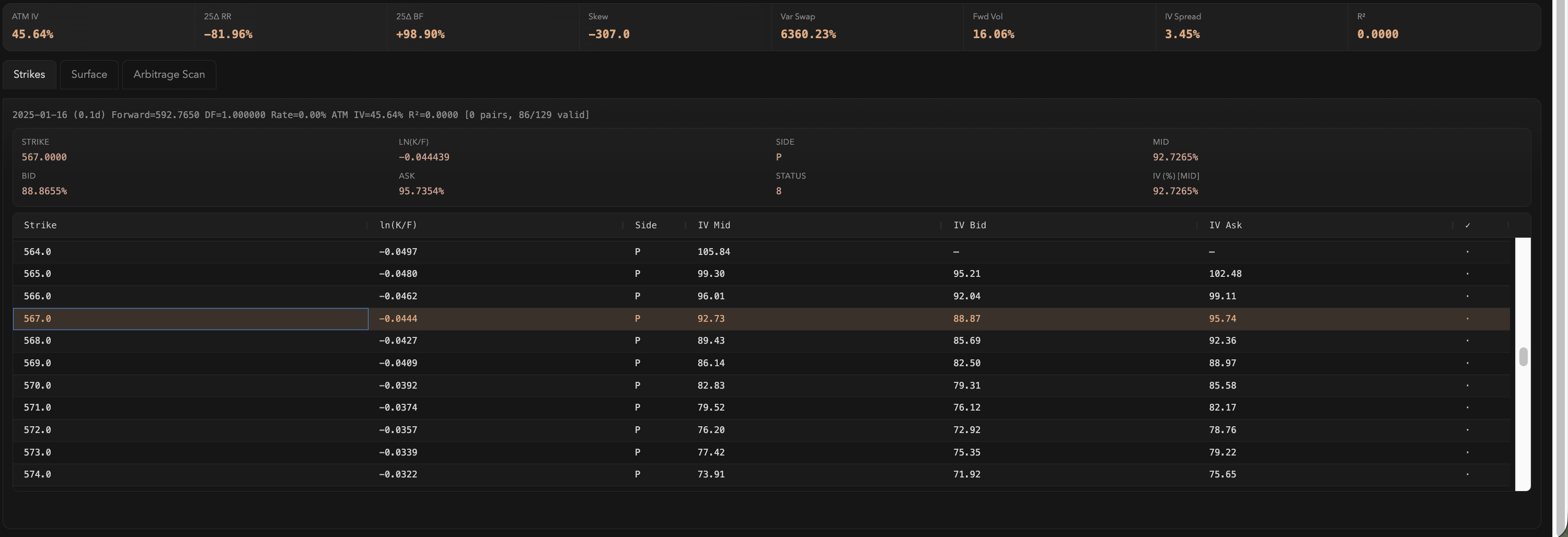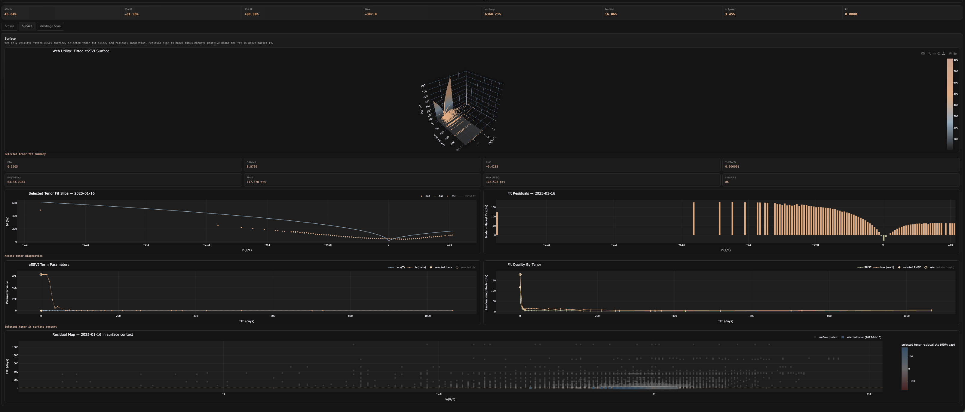Fitted surfaces use the extended Surface SVI parameterization with penalty terms that enforce no-arbitrage constraints — butterfly and calendar spread violations are penalized during optimization. Each tenor produces 8 diagnostic metrics (ATM IV, 25-delta risk reversal, 25-delta butterfly, skew, variance swap level, forward vol, IV spread, and R²) plus residual plots.
