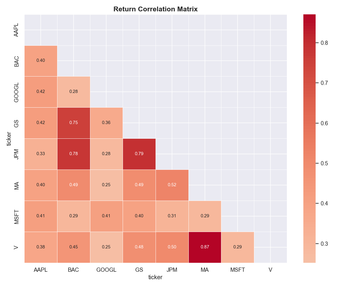 Historical price data for 8 financial stocks was pulled from Yahoo Finance and ingested into a normalized SQLite database through an automated pipeline. The schema tracks prices, returns, and computed statistics separately to support analytical queries without recomputation.