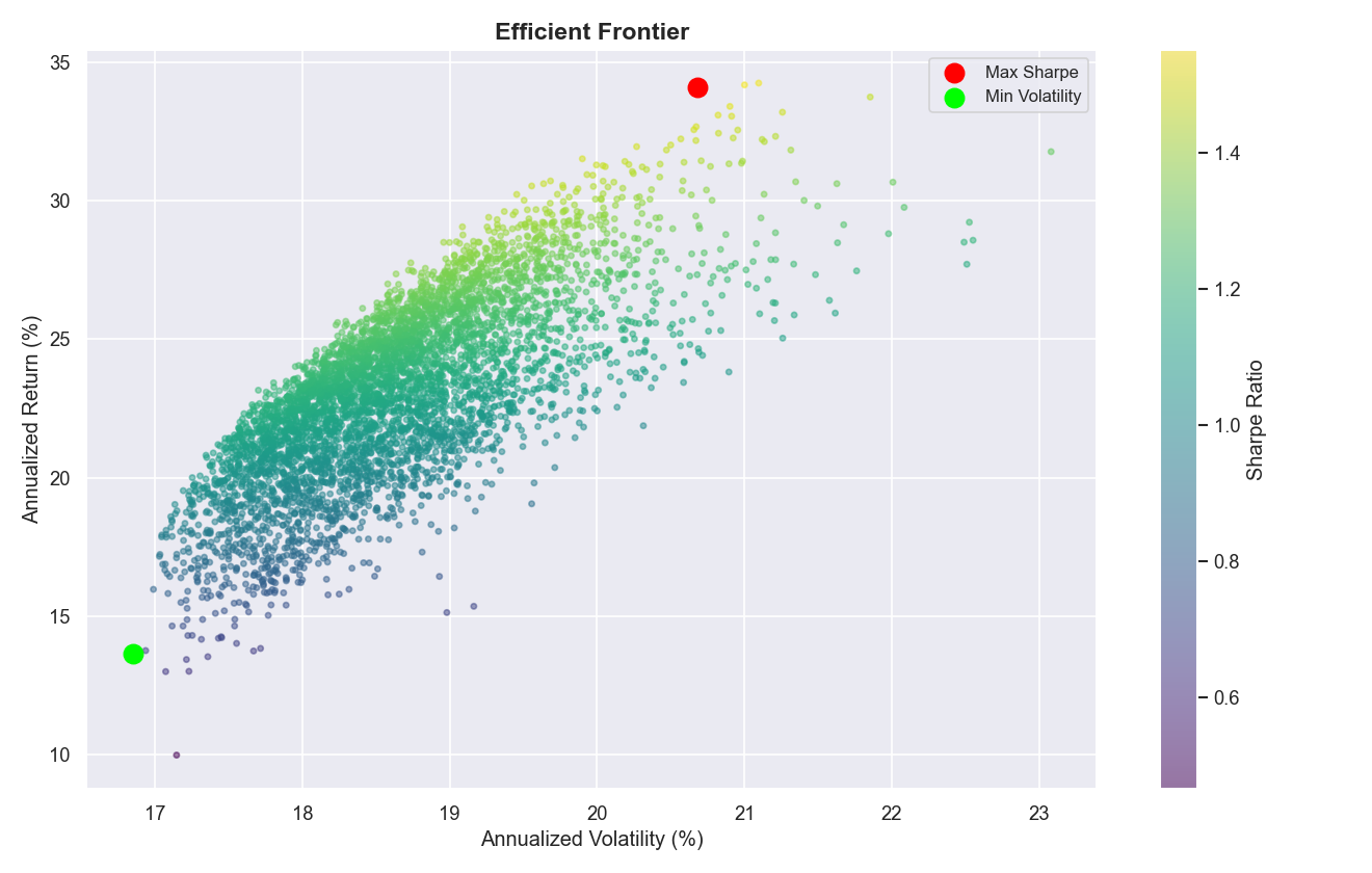 The Sharpe-optimal portfolio — the point on the efficient frontier with the highest risk-adjusted return — was identified from the simulation results. This is the standard metric used by portfolio managers to compare strategies on a risk-normalized basis.
