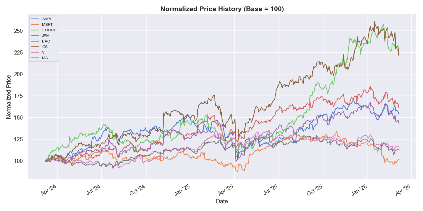 Normalized Price History — All 8 stocks normalized to base 100 over 2 years