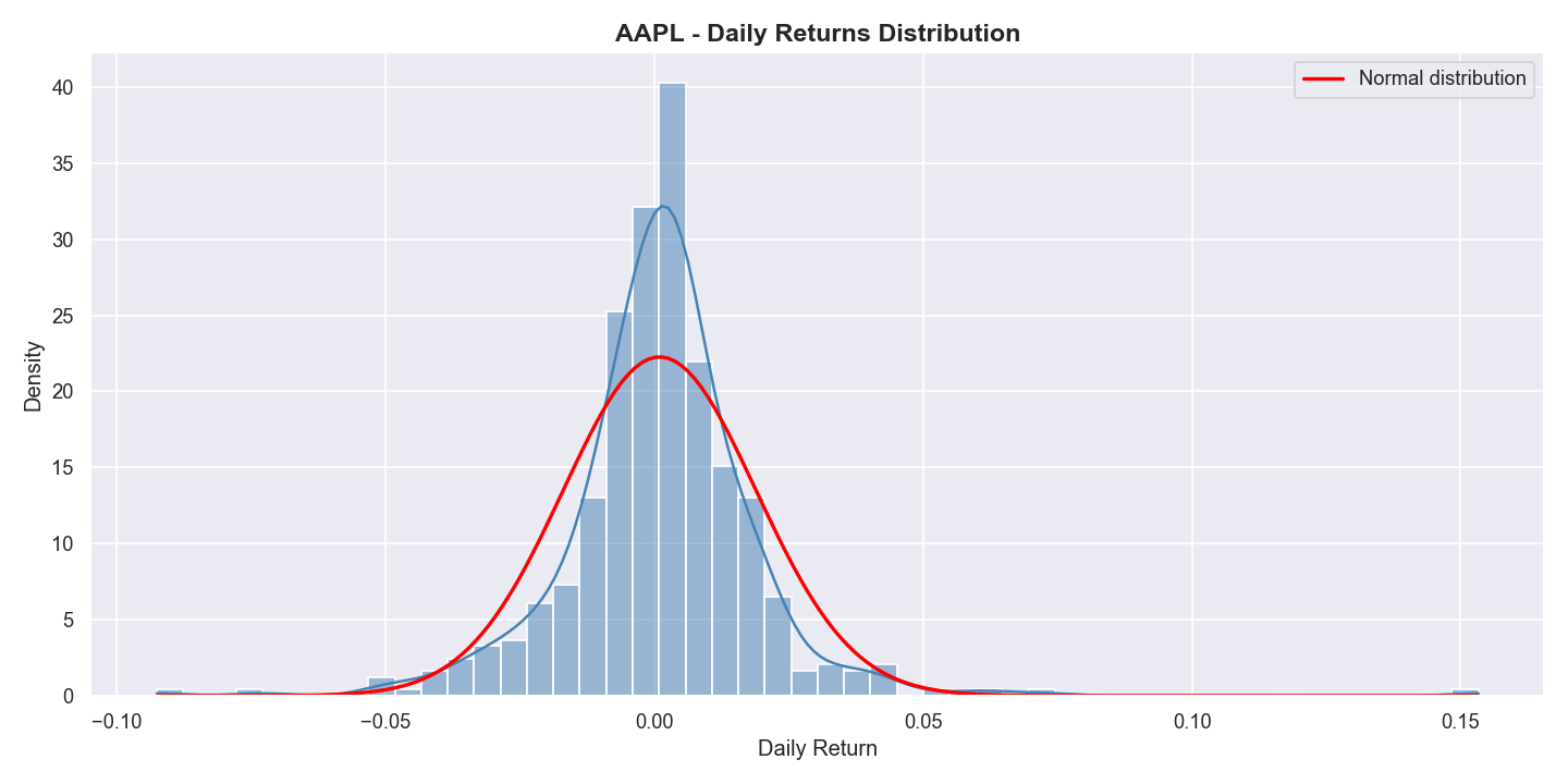 Returns Distribution (AAPL) — Daily return histogram with normal distribution overlay