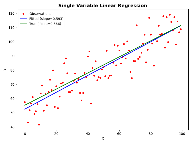 Single Variable Regression Fit — Observed data, fitted line, and true line